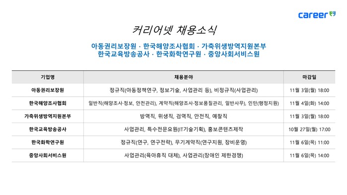 취업 포털 커리어가 아동권리보장원, 한국해양조사협회, 가축위생방역지원본부, 한국교육방송공사, 한국화학연구원, 중앙사회서비스원의 채용 소식을 24일 발표했다.