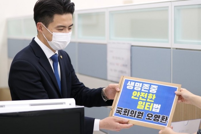 지난해 6월 오영환 의원이 ‘생명존중 안전한 일터 3법’ 법안을 국회사무처에 제출하고 있는 모습