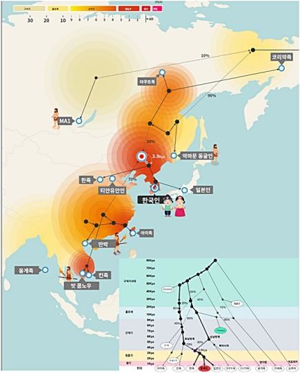 한국인과 동아시아인 기원 예측 모델에 기반한 한국인 혼혈과 관계된 고대와 현대 게놈들. 수만 년간 존재했던 많은 인족 중 게놈정보가 밝혀진 인족(회색 박스 내 혼혈 족보)들을 기준으로 삼아 한국인의 기원과 혼합을 컴퓨터로 예측한 그림. /클리노믹스 연합뉴스