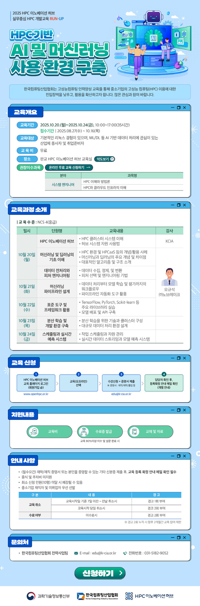 · 지원 방법: HPC 이노베이션허브 교육 홈페이지 수강 신청 후 edu@k-cia.or.kr로 증명서 제출