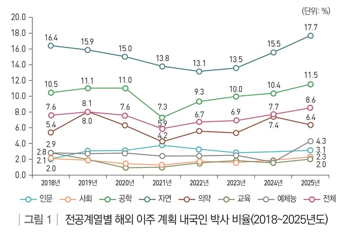 자연 계열 박사는 2018년 16.4%에서 2022년 13.1%로 해외 이주 계획이 줄어들다가 최근까지 늘어나는 경향을 보였고, 공학 계열 박사는 2018년 10.5%에서 2021년 7.3%로 해외 이주 계획이 줄어들다가 자연 계열과 마찬가지로 최근까지 늘어나는 경향을 보였다.