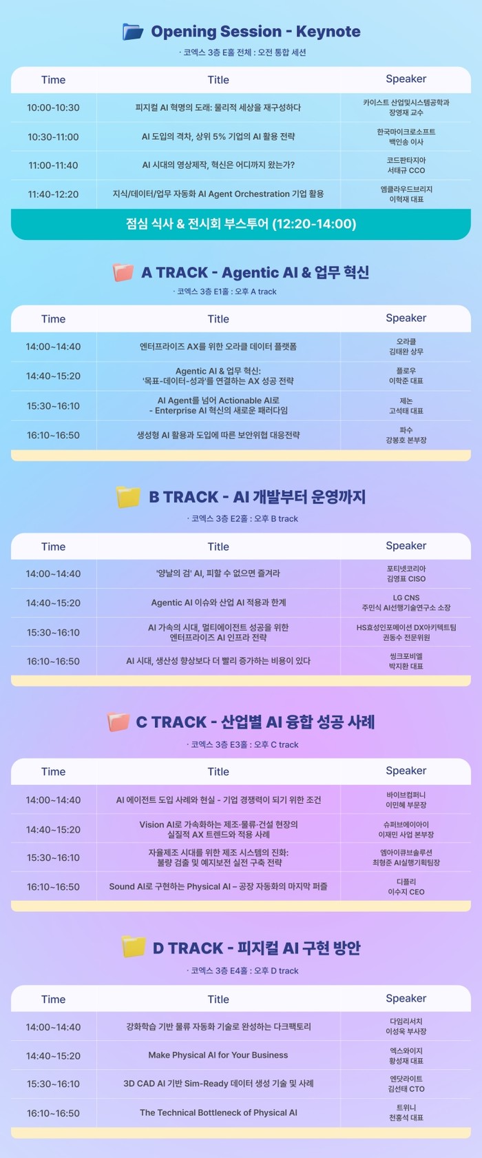 C트랙 ‘산업별 AI 융합 성공 사례’는 AI의 실제 현장 적용 사례에 초점을 맞춘다. 바이브컴퍼니 이민혜 부문장은 ‘AI 에이전트 도입 사례와 현실 - 기업 경쟁력이 되기 위한 조건’이라는 제목의 발표를 통해 조직 차원의 도입 조건을 설명한다. 슈퍼브에이아이 이재민 사업본부장은 ‘비전 AI(Vision AI)로 가속화하는 제조·물류·건설 현장의 실질적 AX 전환 트렌드와 적용 사례’를, 엠아이큐브솔루션 최형준 수석은 ‘자율제조 시대를 위한 제조 시스템의 진화: 불량 검출 및 예지보전 실전 구축 전략’을 주제로 각각 발표한다. 마지막으로 디플리 이수지 CEO는 ‘사운드 AI(Sound AI)로 구현하는 피지컬 AI(Physical AI) - 공장 자동화의 마지막 퍼즐’을 주제로 음향 AI 기반 자동화 가능성을 제시한다.