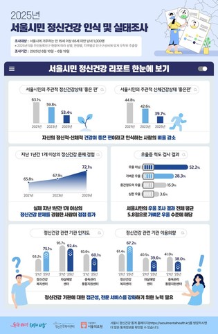 해당 조사결과는 ‘2025 서울시민 정신건강 인식 및 실태조사 보고서’와 함께 주요 결과를 인포그래픽으로 제작해 배포됐다. 더 자세한 내용은 서울시 정신건강통계 홈페이지(https://seoulmentalhealth.kr)를 통해 누구나 열람할 수 있다.
