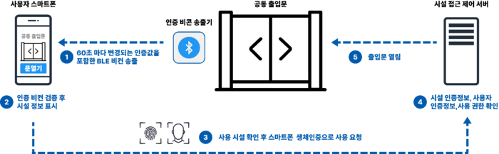 한편 블루투스(BLE)를 이용해 스마트폰만 소지하면 공동시설에 접근할 수 있는 기술도 등장했지만, 사용자가 실제로 출입을 하려고 한 것인지 단순히 지나가려고 한 것인지 사용자 의도가 명확히 반영되지 않는 문제와 함께 고정된 BLE 신호를 복제해 사용하면 사용자가 시설 인근에 있지 않더라도 명령을 재전송할 수 있는 리플레이 공격이 가능한 보안 취약성으로 인해 보안이 요구되는 공동시설에는 적극 활용하기가 어려웠다.